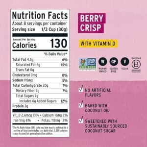 Purely Elizabeth’s Berry Crisp Ancient Grain Granola with Vitamin D delivers delicious taste and superfood nutrition. Salty-sweet granola clusters with raspberries, strawberries, blueberries and organic oats for a crunchy texture and irresistible taste.